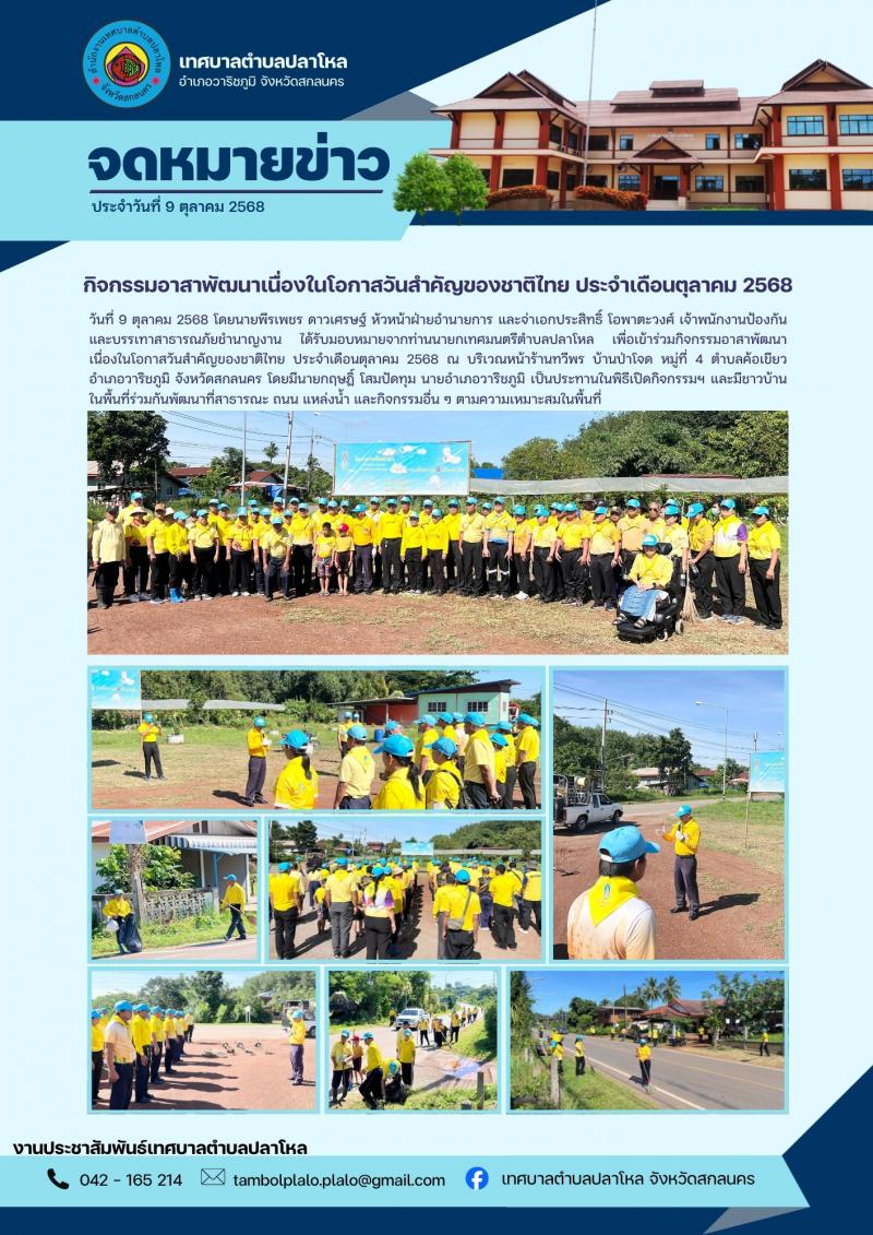 ผู้ลงข่าว : นางสาววรกร ภูเวียงแก้ว จำนวนผู้อ่าน : 7 คน กิจกรรมอาสาพัฒนาเนื่องในโอกาสวันสำคัญของชาติไทย ประจำเดือนตุลาคม 2568วันที่ 9 ตุลาคม 2568 โดยนายพีรเพชร ดาวเศรษฐ์ หัวหน้าฝ่ายอำนายการ และจ่าเอกประสิทธิ์ โอพาตะวงศ์ เจ้าพนักงานป้องกันและบรรเทาสาธารณภัยชำนาญงาน ได้รับมอบหมายจากท่านนายกเทศมนตรีตำบลปลาโหล เพื่อเข้าร่วมกิจกรรมอาสาพัฒนาเนื่องในโอกาสวันสำคัญของชาติไทย...