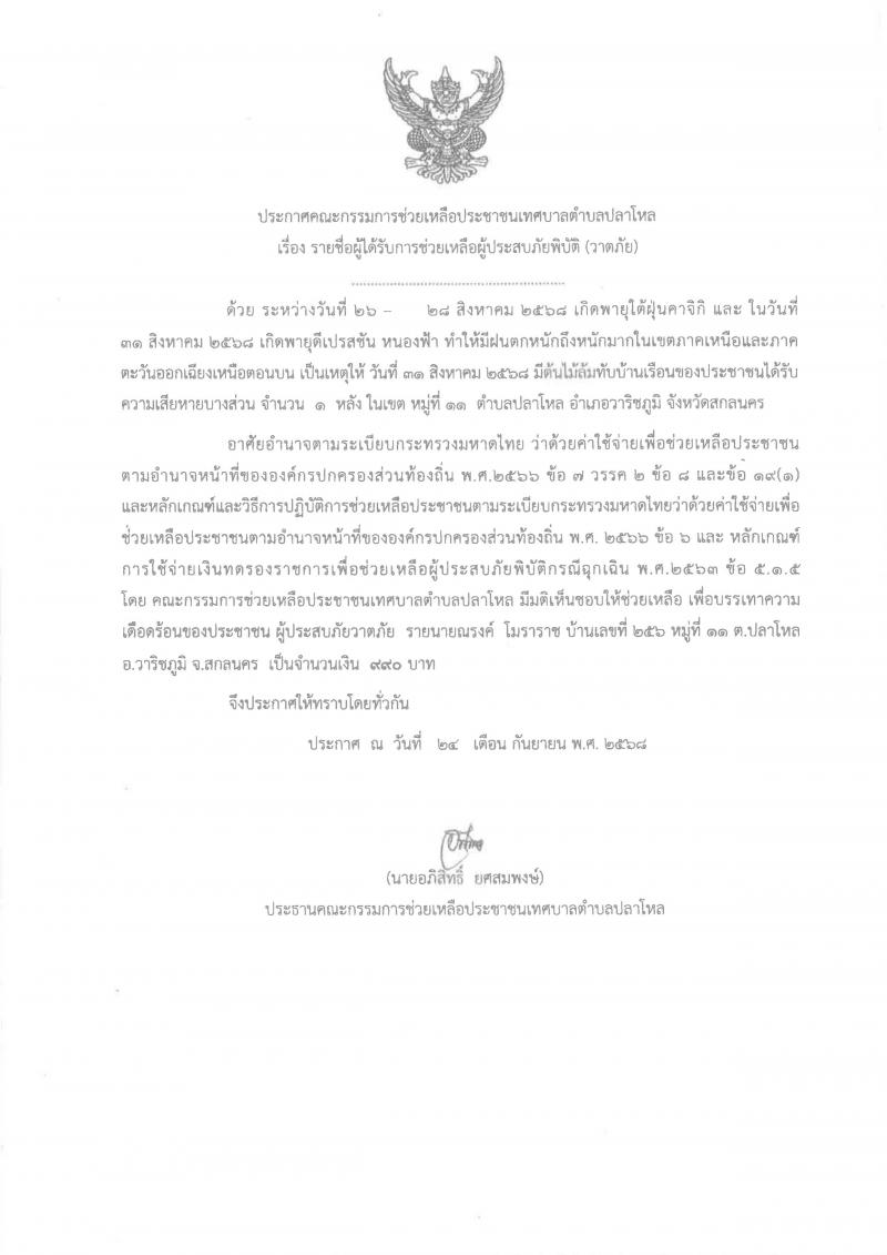 ผู้ลงข่าว : นางสาววรกร ภูเวียงแก้ว จำนวนผู้อ่าน : 14 คน กิจกรรมซ่อมแซมบ้านตามโครงการปรับสภาพแวดล้อมและสิ่งอำนวยความสะดวกของผู้สูงอายุ ณ บ้านนายบุญโฮม ธรรมาอ่อน บ้านเลขที่ 41 หมู่ที่ 13 บ้านพรสวรรค์ ตำบลปลาโหล อำเภอวาริชภูมิ จังหวัดสกลนครวันที่ 15 สิงหาคม 2568 นำโดยท่านนายกอภิสิทธิ์ ยศสมพงษ์ คณะผู้บริหาร เจ้าหน้าที่เทศบาล อพม.ตำบลปลาโหล และเจ้าหน้าที่กองสวัสดิการสังคม ได้เข้าร่วมกิจกรรมซ่อมแซมบ้านตามโครงการปรับสภาพแวดล้อมและสิ่งอำนวยความสะดวกของผู้สูงอายุ...เจ้าหน้าที่ป้องกันบรรเทาสาธารณภัยลงพื้นที่ปฏิบัตงานตาม ข้อร้องเรียนปัญหาเหตุรำคาญเนื่องจากมีแมว จรจัด ที่ ไม่ได้รับการดูแลจากเจ้าของ14 สิงหาคม 2568 เวลา 10:00 น เทศบาลตำบลปลาโหล พร้อมเจ้าหน้าที่ป้องกันบรรเทาสาธารณภัยลงพื้นที่ปฏิบัตงานตาม ข้อร้องเรียนปัญหาเหตุรำคาญเนื่องจากมีแมว จรจัด ที่ ไม่ได้รับการดูแลจากเจ้าของ ไปขโมย ทรัพย์สินของใช้ ของ เพื่อนบ้าน...มอบสวัสดิการกองทุนธนาคารขยะรีไซเคิล ให้ครอบครัวของคุณชาญชัย พุทธชาติวันที่ 8 สิงหาคม 2568 เวลา 09:30 น. นายอภิสิทธิ์ ยศสมพงษ์ นายกเทศมนตรีตำบลปลาโหล มอบหมาย ผู้อำนวยการกองสาธารณสุขและสิ่งแวดล้อม พนักงานเทศบาล ร่วมมอบสวัสดิการกองทุนธนาคารขยะรีไซเคิล ให้ครอบครัวของคุณชาญชัย พุทธชาติ บ้านเลขที่...ประกาศคณะกรรมการช่วยเหลือประชาชนเทศบาลตำบลปลาโหล เรื่อง รายชื่อผู้ได้รับการช่วยเหลือผู้ประสบภัยพิบัติ (วาตภัย)ประกาศคณะกรรมการช่วยเหลือประชาชนเทศบาลตำบลปลาโหล เรื่อง รายชื่อผู้ได้รับการช่วยเหลือผู้ประสบภัยพิบัติ (วาตภัย)