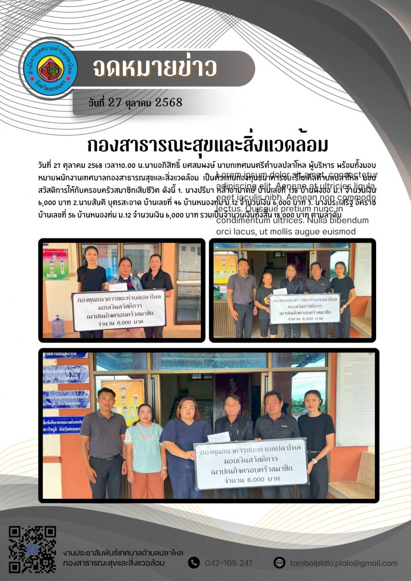 ผู้ลงข่าว : นางสาววรกร ภูเวียงแก้ว จำนวนผู้อ่าน : 6 คน มอบสวัสดิการให้กับครอบครัวสมาชิกเสียชีวิตวันที่ 27 ตุลาคม 2568 เวลา10.00 น.นายอภิสิทธิ์ ยศสมพงษ์ นายกเทศมนตรีตำบลปลาโหล ผู้บริหาร พร้อมทั้งมอบหมายพนักงานเทศบาลกองสาธารณสุขและสิ่งแวดล้อม เป็นตัวแทนกองทุนธนาคารขยะรีไซเคิลตำบลปลาโหล มอบสวัสดิการให้กับครอบครัวสมาชิกเสียชีวิต...