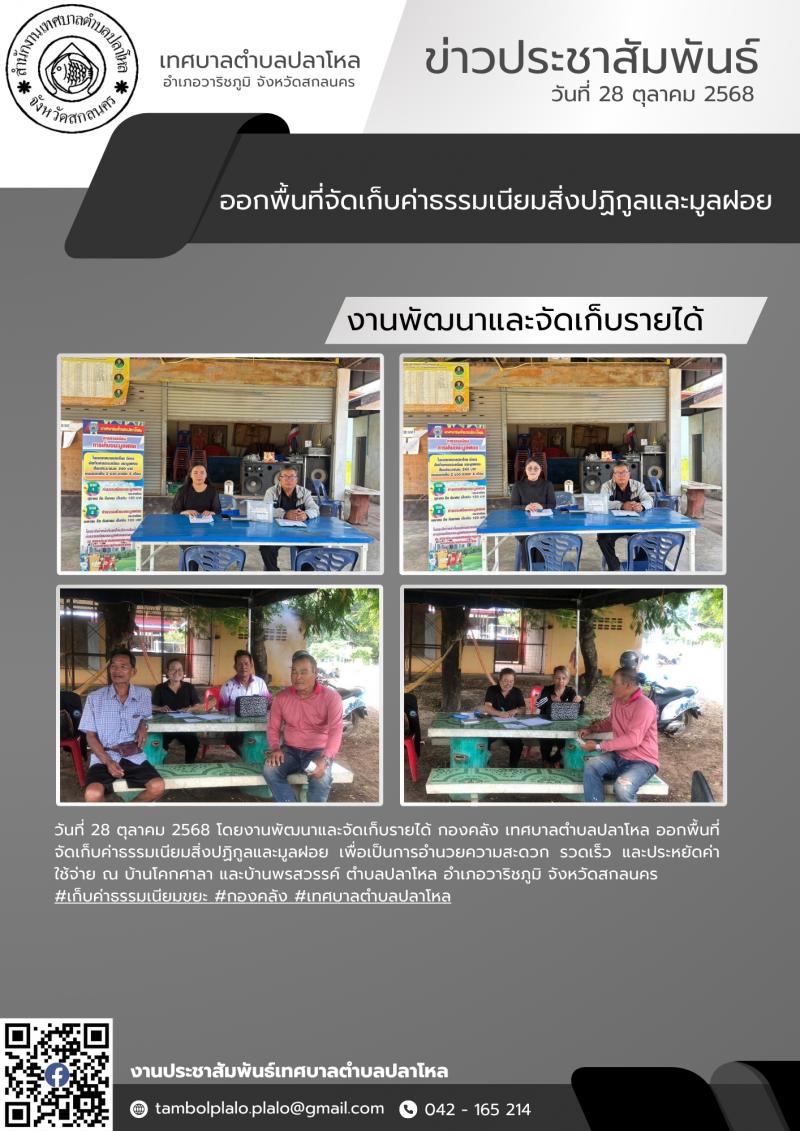 ออกพื้นที่จัดเก็บค่าธรรมเนียมสิ่งปฏิกูลและมูลฝอย บ้านโคกศาลา และบ้านพรสวรรค์วันที่ 28 ตุลาคม 2568 โดยงานพัฒนาและจัดเก็บรายได้ กองคลัง เทศบาลตำบลปลาโหล ออกพื้นที่จัดเก็บค่าธรรมเนียมสิ่งปฏิกูลและมูลฝอย เพื่อเป็นการอำนวยความสะดวก รวดเร็ว และประหยัดค่าใช้จ่าย ณ บ้านโคกศาลา และบ้านพรสวรรค์ ตำบลปลาโหล...