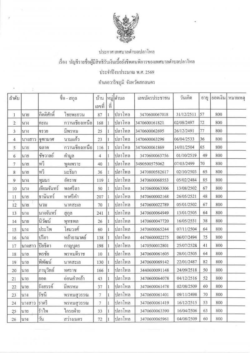 ผู้ลงข่าว : นางสาววรกร ภูเวียงแก้ว จำนวนผู้อ่าน : 12 คน ประกาศเทศบาลตำบลปลาโหล เรื่อง บัญชีรายชื่อผู้มีสิทธิรับเงินเบี้ยยังชีพคนพิการของเทศบาลตำบลปลาโหล ประจำปีงบประมาณ พ.ศ.2569 อำเภอวาริชภูมิ จังหวัดสกลนครประกาศเทศบาลตำบลปลาโหล เรื่อง บัญชีรายชื่อผู้มีสิทธิรับเงินเบี้ยยังชีพคนพิการของเทศบาลตำบลปลาโหล ประจำปีงบประมาณ พ.ศ.2569 อำเภอวาริชภูมิ จังหวัดสกลนคร
