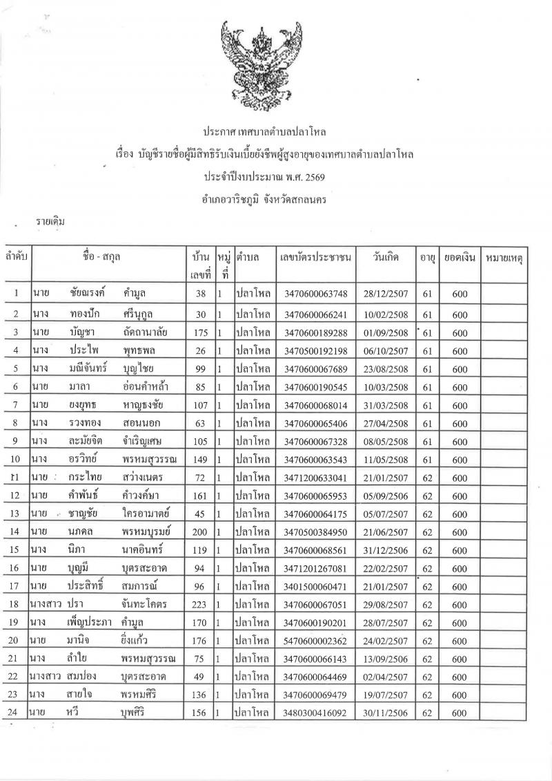 ผู้ลงข่าว : นางสาววรกร ภูเวียงแก้ว จำนวนผู้อ่าน : 15 คน ร่วมพิธีสรงน้ำพระบรมศพ เบื้องหน้าพระฉายาลักษณ์ สมเด็จพระนางเจ้าสิริกิจติ์ พระบรมราชินีนาถ พระบรมราชชนนีพันปีหลวงวันอาทิตย์ที่ 26 ตุลาคม พ.ศ.2568 นายคำเขื่อง ร่มเกษ รองนายกเทศมนตรีตำบลปลาโหล พร้อมคณะผู้บริหาร เเละเจ้าหน้าที่พนักงานเทศบาลตำบลปลาโหล ร่วมพิธีสรงน้ำพระบรมศพ เบื้องหน้าพระฉายาลักษณ์ สมเด็จพระนางเจ้าสิริกิจติ์ พระบรมราชินีนาถ...วางพวงมาลาเบื้องหน้าพระบรมราชานุสาวรีย์พระบาทสมเด็จพระจุลจอมเกล้าเจ้าอยู่หัว เนื่องในวันคล้าย “วันสวรรคตพระบาทสมเด็จพระจุลจอมเกล้าเจ้าอยู่หัว ประจำปีพุทธศักราช ๒๕๖๘”เมื่อวันที่ ๒๓ ตุลาคม ๒๕๖๘ โดยนายคำเขื่อง ร่มเกษ รองนายกเทศมนตรีตำบลปลาโหล เป็นผู้แทนวางพวงมาลาเบื้องหน้าพระบรมราชานุสาวรีย์พระบาทสมเด็จพระจุลจอมเกล้าเจ้าอยู่หัว เนื่องในวันคล้าย “วันสวรรคตพระบาทสมเด็จพระจุลจอมเกล้าเจ้าอยู่หัว...ออกพื้นที่จัดเก็บค่าธรรมเนียมสิ่งปฏิกูลและมูลฝอย บ้านผักตบ ม.7 และบ้านผักตบ ม.16วันที่ 22 ตุลาคม 2568 โดยงานพัฒนาและจัดเก็บรายได้ กองคลัง เทศบาลตำบลปลาโหล ออกพื้นที่จัดเก็บค่าธรรมเนียมสิ่งปฏิกูลและมูลฝอย เพื่อเป็นการอำนวยความสะดวก รวดเร็ว และประหยัดค่าใช้จ่าย ณ บ้านผักตบ ม.7 และบ้านผักตบ ม. 16 ตำบลปลาโหล...ประกาศเทศบาลตำบลปลาโหล เรื่อง บัญชีรายชื่อผู้มีสิทธิรับเงินเบี้ยยังชีพผู้สูงอายุของเทศบาลตำบลปลาโหล ประจำปีงบประมาณ พ.ศ.2569 อำเภอวาริชภูมิ จังหวัดสกลนครประกาศเทศบาลตำบลปลาโหล เรื่อง บัญชีรายชื่อผู้มีสิทธิรับเงินเบี้ยยังชีพผู้สูงอายุของเทศบาลตำบลปลาโหล ประจำปีงบประมาณ พ.ศ.2569 อำเภอวาริชภูมิ จังหวัดสกลนคร