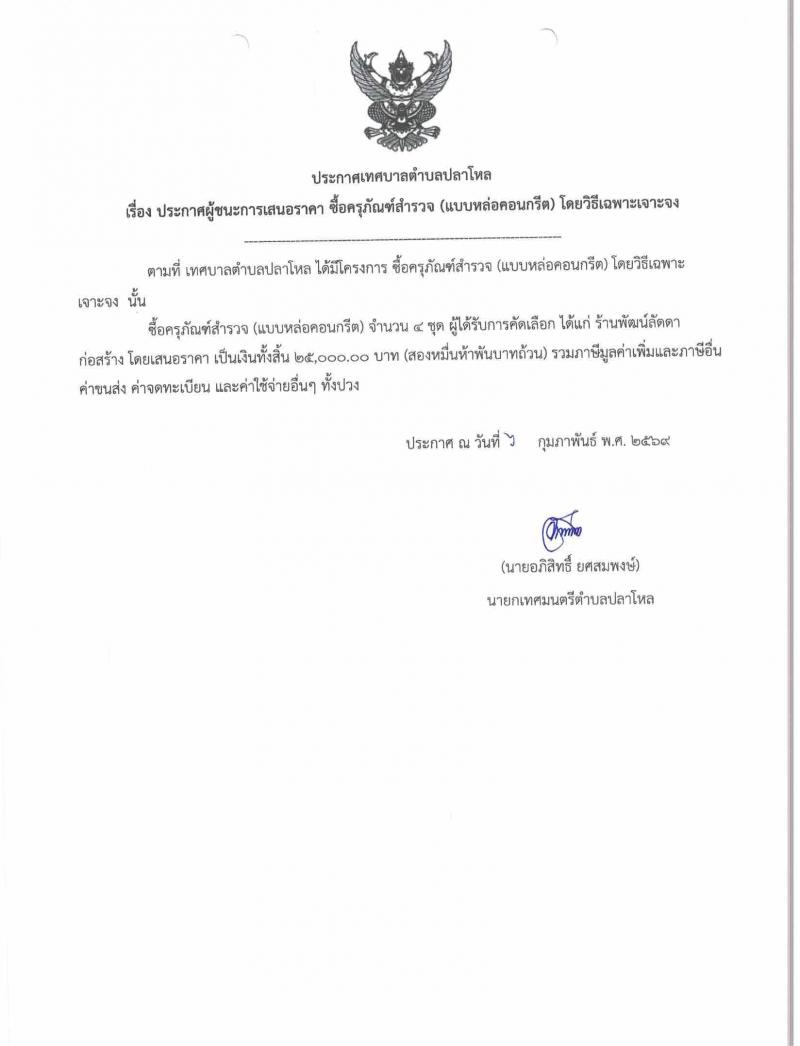 ผู้ลงข่าว : นางสาววรกร ภูเวียงแก้ว จำนวนผู้อ่าน : 2 คน ประกาศเทศบาลตำบลปลาโหล เรื่อง ประกาศผู้ชนะการเสนอราคา ซื้อครุภัณฑ์สำรวจ (แบบหล่อคอนกรีต) โดยวิธีเฉพาะเจาะจงประกาศเทศบาลตำบลปลาโหล เรื่อง ประกาศผู้ชนะการเสนอราคา ซื้อครุภัณฑ์สำรวจ (แบบหล่อคอนกรีต) โดยวิธีเฉพาะเจาะจง