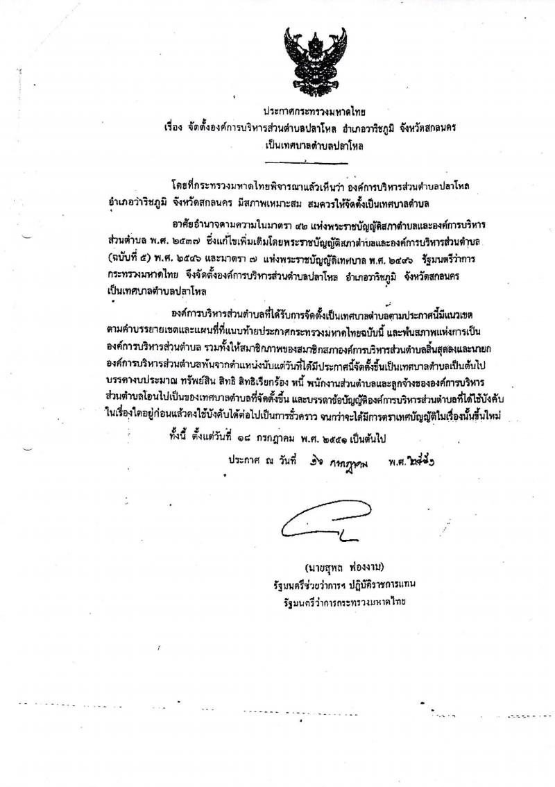 สภาพทั่วไปและข้อมูลพื้นฐาน 1. ด้านกายภาพ 1.1 ลักษณะทั่วไปทางกายภาพ ที่ตั้งและอาณาเขต เทศบาลตำบลปลาโหลในอดีตมีฐานะเป็นสภาตำบลนิติบุคคล ได้รับการยกฐานะเป็นองค์การบริหารส่วนตำบลปลาโหล ตามพระราชบัญญัติสภาตำบลและองค์การบริหาร ส่วนตำบล พ.ศ.2537 เมื่อวันที่ 2 มีนาคม 2539 และได้รับการแต่งตั้งเป็นเทศบาลตำบลปลาโหล ตามประกาศกระทรวงมหาดไทย เมื่อวันที่ 18 กรกฎาคม 2551 และได้รับการประกาศเป็นเทศบาลขนาดกลาง เมื่อวันที่ 28 ธันวาคม 2554 ในการกำกับดูแลของนายอำเภอ ผู้ว่าราชการจังหวัดและกระทรวงมหาดไทย โดยมีนายกเทศมนตรีตำบลปลาโหล นายดำเนิน สอนไชยา เป็นผู้บริหารสูงสุดภายในเขตเทศบาลตำบลปลาโหล มีภารกิจอำนาจหน้าที่ภายใต้ระเบียบกฎหมาย ข้อบังคับและมติ ครม. ที่เกี่ยวข้อง เทศบาลตำบลปลาโหล ตั้งอยู่หมู่ที่ 4 บ้านปลาโหล ตำบลปลาโหล อำเภอวาริชภูมิ จังหวัดสกลนคร ทางทิศเหนือของจังหวัดสกลนครอยู่ในเขตระหว่างละติจูด 113 องศา 35 ลิปดา ถึงละติจูด 113 องศา 45 ลิปดา และลองติจูด 17 องศา 15 ลิปดา ถึงลองติจูด 17 องศา 25 ลิปดา มีเนื้อที่ประมาณ 115 ตารางกิโลเมตร หรือประมาณ 71,875 ไร่ มีระยะทางห่างจากอำเภอวาริชภูมิ ประมาณ 7 กิโลเมตร และห่างจากจังหวัดสกลนคร ประมาณ 62 กิโลเมตร อยู่ห่างจากกรุงเทพมหานคร ประมาณ 711 กิโลเมตร เทศบาลตำบลปลาโหล มีอาณาเขตติดต่อ ดังนี้ ทิศเหนือ ติดต่อ ตำบลพังโคน และตำบลม่วงไข่ อำเภอพังโคน ทิศใต้ ติดต่อ ตำบลวาริชภูมิ อำเภอวาริชภูมิ ทิศตะวันออก ติดต่อ ตำบลแร่ อำเภอพังโคน ทิศตะวันตก ติดต่อ ตำบลหนองลาด อำเภอวาริชภูมิ และตำบลตาลเนิ้ง อำเภอสว่างแดนดิน < ช่องทางการติดต่อสื่อสาร โทรศัพท์/ โทรสาร. 0-4216-5214 www.plalo.go.th E-Mail : tambolplalo @ hotmail.com