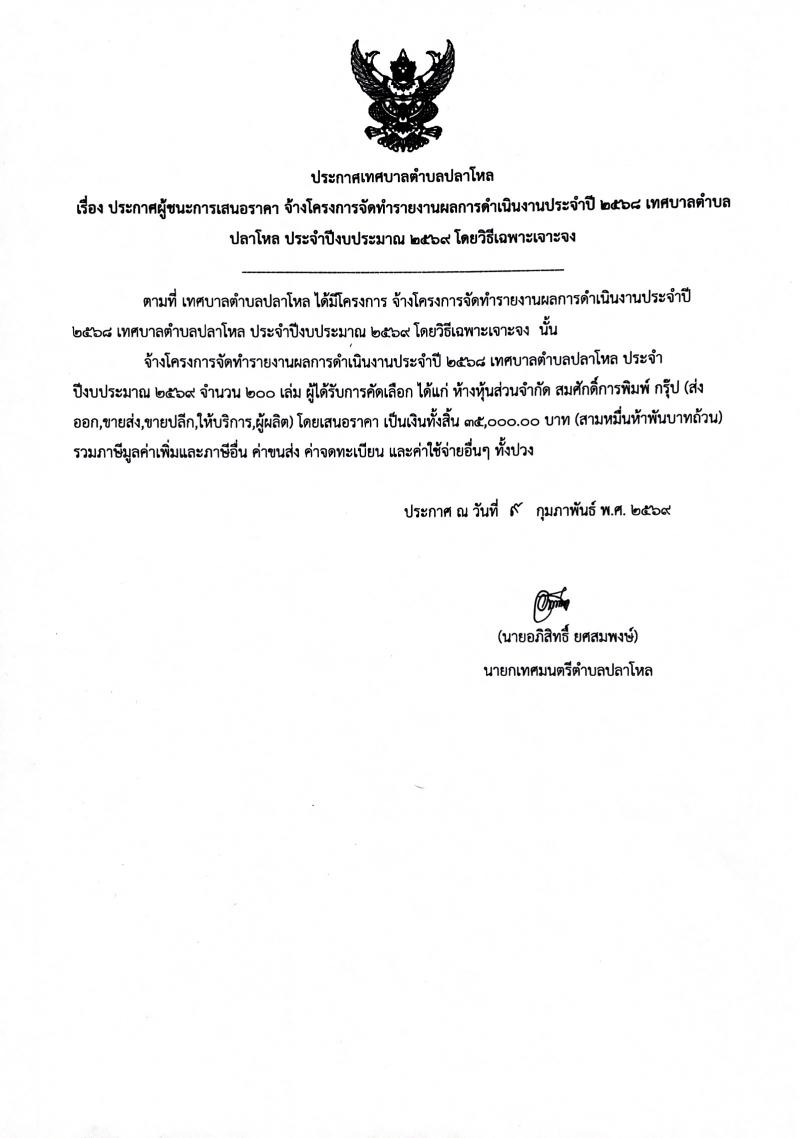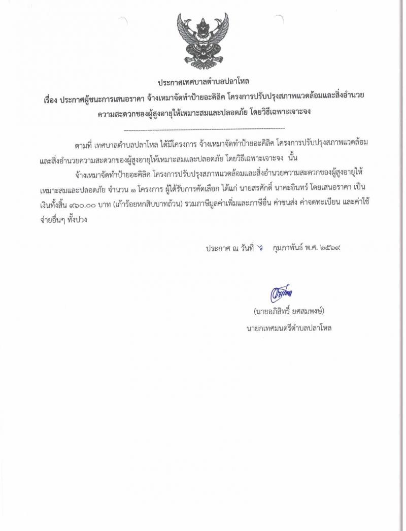 ผู้ลงข่าว : สำนักปลัด เทศบาลตำบลปลาโหล จำนวนผู้อ่าน : 5 คน การประชุมปรึกษาหารือการจัดโครงการแข่งขันกีฬาต้านยาเสพติด ประจำปีงบประมาณ 2569ข่าวประชาสัมพันธ์ กองการศึกษา เทศบาลตำบลปลาโหล เรื่อง การประชุมปรึกษาหารือการจัดโครงการแข่งขันกีฬาต้านยาเสพติด ประจำปีงบประมาณ 2569 เพื่อวางแผนและกำหนดแนวทางการจัดโครงการแข่งขันกีฬาต้านยาเสพติด ประจำปีงบประมาณ...ปรับเกรดถนนภายในหมู่บ้าน สายบ้านพรสวรรค์ หมู่ที่ 13 และบ้านโคกศาลา หมู่ที่ 8 ตำบลปลาโหล อำเภอวาริชภูมิ จังหวัดสกลนครเมื่อวันที่ 2 กุมภาพันธ์ 2569 เทศบาลตำบลปลาโหล ได้ดำเนินการปรับเกรดถนนภายในหมู่บ้าน สายบ้านพรสวรรค์ หมู่ที่ 13 และบ้านโคกศาลา หมู่ที่ 8 ตำบลปลาโหล อำเภอวาริชภูมิ จังหวัดสกลนคร เพื่อปรับปรุงสภาพถนนให้มีความเรียบร้อย สะดวก...พิธีบำเพ็ญกุศลสตมวาร (ครบ 100 วัน) เนื่องในโอกาสวันสัตมวาน สมเด็จพระนางเจ้าสิริกิติ์ พระบรมราชินีนาถ พระบรมราชชนนีพันปีหลวง ณ วัดรามวิทยาลัย บ้านปลาโหล หมู่ที่ 4 ตำบลปลาโหล อำเภอวาริชภูมิ จังหวัดสกลนครเทศบาลตำบลปลาโหล ร่วมพิธีบำเพ็ญกุศลสตมวาร สมเด็จพระนางเจ้าสิริกิติ์ พระบรมราชินีนาถ พระบรมราชชนนีพันปีหลวง วันที่ 31 มกราคม 2569 เวลา 14.30 น. นายกฤษฎิ์ โสมปัดทุม นายอำเภอวาริชภูมิ เป็นประธานในพิธีบำเพ็ญกุศลสตมวาร...ประกาศเทศบาลตำบลปลาโหล เรื่อง ประกาศผู้ชนะการเสนอราคา จ้างเหมาจัดทำป้ายอะคิลิค โครงการปรับปรุงสภาพแวดล้อมและสิ่งอำนวยความสะดวกของผู้สูงอายะให้เหมาะสมและปลอดภัย โดยวิธีเฉพาะเจาะจงประกาศเทศบาลตำบลปลาโหล เรื่อง ประกาศผู้ชนะการเสนอราคา จ้างเหมาจัดทำป้ายอะคิลิค โครงการปรับปรุงสภาพแวดล้อมและสิ่งอำนวยความสะดวกของผู้สูงอายะให้เหมาะสมและปลอดภัย โดยวิธีเฉพาะเจาะจง