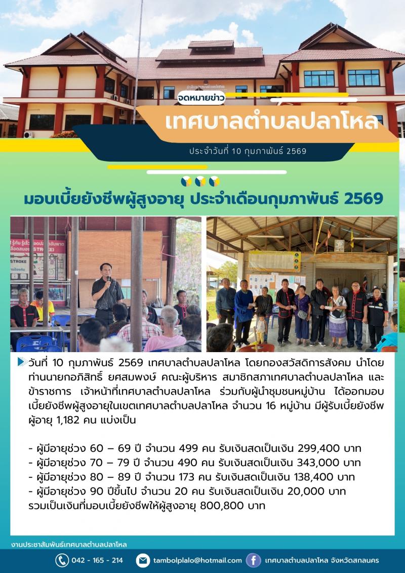 ผู้ลงข่าว : นางสาววรกร ภูเวียงแก้ว จำนวนผู้อ่าน : 3 คน มอบเบี้ยยังชีพผู้สูงอายุในเขตเทศบาลตำบลปลาโหล ประจำเดือนกุมภาพันธ์ 2569วันที่ 10 กุมภาพันธ์ 2569 เทศบาลตำบลปลาโหล โดยกองสวัสดิการสังคม นำโดย ท่านนายกอภิสิทธิ์ ยศสมพงษ์ คณะผู้บริหาร สมาชิกสภาเทศบาลตำบลปลาโหล และข้าราชการ เจ้าหน้าที่เทศบาลตำบลปลาโหล ร่วมกับผู้นำชุมชนหมู่บ้าน ได้ออกมอบเบี้ยยังชีพผู้สูงอายุในเขตเทศบาลตำบลปลาโหล...