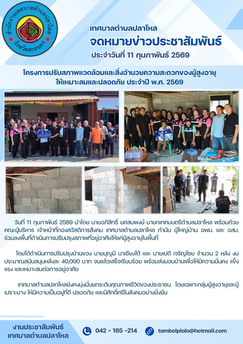 ผู้ลงข่าว : นางสาววรกร ภูเวียงแก้ว จำนวนผู้อ่าน : 3 คน มอบเบี้ยยังชีพผู้สูงอายุประจำเดือนกุมภาพันธ์ 2569วันที่ 10 กุมภาพันธ์ 2569 เทศบาลตำบลปลาโหล โดยกองสวัสดิการสังคม นำโดย ท่านนายกอภิสิทธิ์ ยศสมพงษ์ คณะผู้บริหาร สมาชิกสภาเทศบาลตำบลปลาโหล และข้าราชการ เจ้าหน้าที่เทศบาลตำบลปลาโหล ร่วมกับผู้นำชุมชนหมู่บ้าน ได้ออกมอบเบี้ยยังชีพผู้สูงอายุในเขตเทศบาลตำบลปลาโหล...